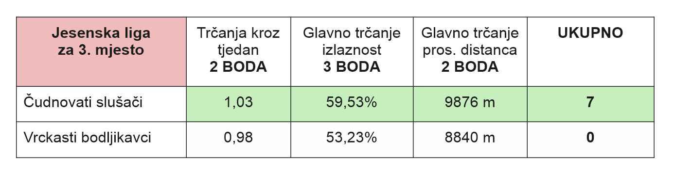 U dvoboju za broncu, Čudnovati slušači odradili su disciplinirano kolo i uzeli treće mjesto zasluženo i smireno. Njihov prosjek trčanja kroz tjedan iznosio je 1.03, što je bilo sasvim dovoljno za dva boda, a ključ je bio u izlaznosti na glavno trčanje – 59,53%. To možda ne zvuči kao “masovna mobilizacija”, ali u odnosu na protivnike bilo je presudno. Uz to, prosječna dužina glavnog trčanja bila je 9876 m, što pokazuje da su zadržali ozbiljnu “metražu” i kraj lige završili u rastu.