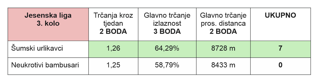 Slušači su (napokon!) odradili disciplinirano kolo i uzeli maksimalan paket bodova. 1,13 trčanja kroz tjedan, izlaznost 56,28% i prosječna distanca 7831 m – sve tri metrike bile su iznad Bodljikavaca (1,10; 52,69%; 7416 m). Nije to bila golema razlika u kilometrima, ali je bila dovoljno konzistentna u svakoj rubrici da donese čistu pobjedu. Vrckasti su opet bili blizu, no da bi se okrenula sreća, treba im par postotaka više sudjelovanja i koji stotinjak metara dužeg glavnog trčanja.