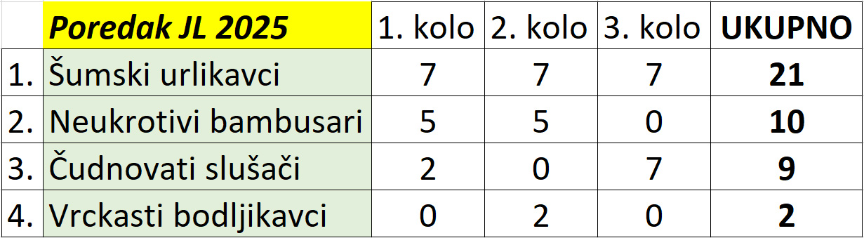 Urlikavci su „čisti“ kroz grupni dio – tri kola, tri puta maksimalno! Bambusari ostaju visoko na drugom mjestu zahvaljujući dva vrlo dobra uvodna tjedna. Slušači su možda u pravo vrijeme uhvatili ritam i osvojili bodove, no zadržavaju tek treću poziciju. Bodljikavci su zasad rezultatski skromniji, ali brojke im govore da uz malo jači odaziv mogu promijeniti sliku.